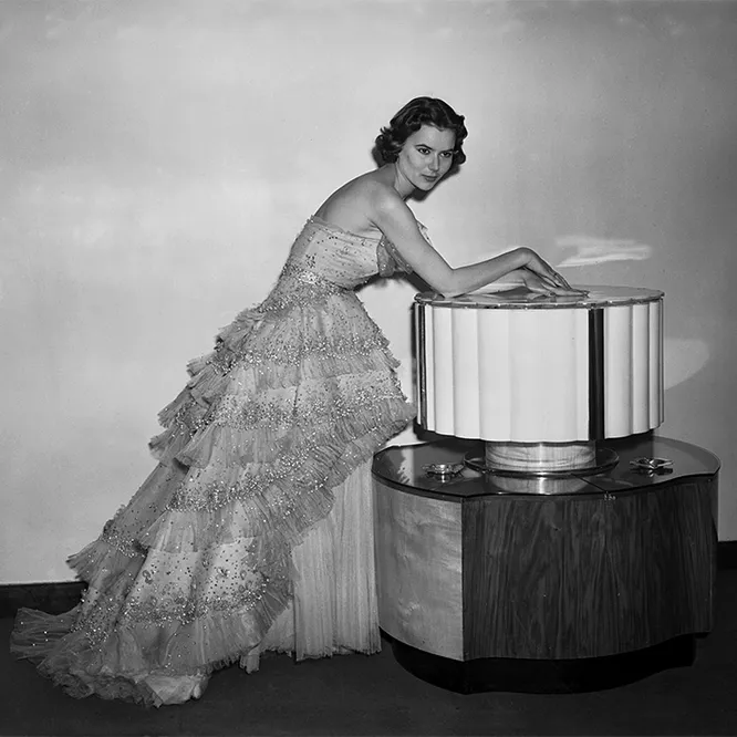 Модель Сильви в вечернем платье «Моцарт» во время показа в отеле Savoy, Лондон, 24 апреля 1950 года
