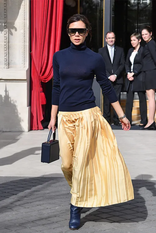 Виктория Бекхэм любит черный цвет. Очень. В ее гардеробной хранится, пожалуй, самая большая в мире коллекция черных водолазок и свитеров, которые она часто носит с брюками, обувью и сумками в тон. Однако в последнее время Вики начала добавлять к «мрачным» образам цветные акценты в виде пастельных ботильонов или юбок с пестрыми узорами, так что упрекнуть ее особо не в чем.