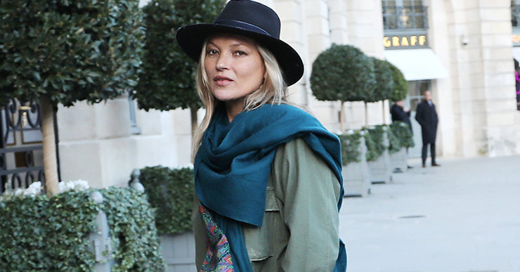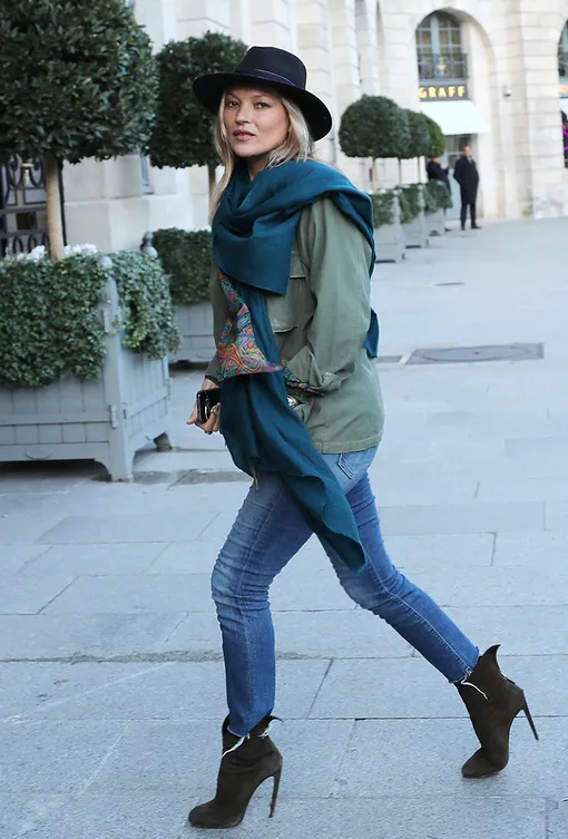 Для первого дня во французской столице Кейт выбрала скинни-джинсы Mother Denim, легкую куртку цвета хаки, черную федору и замшевые ботильоны — впрочем, даже очень высокий каблук не смог повлиять на уверенную походку нашей героини, вот что значит многолетний модельный опыт.