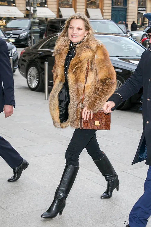 Неделя моды в Париже в самом разгаре — сегодня свои осенне-зимние коллекции показывают Dior и Saint Laurent. 44-летняя супермодель Кейт Мосс последние 20 лет не пропускает показы мастодонтов мира моды. Этот сезон не стал исключением — Кейт прибыла в Париж. Будучи во французской столице, она попыталась сойти за местную. Чтобы слиться с француженками, ей понадобилось: рыжий полушубок, который так любила Джейн Биркин, платок в горошек, изящно повязанный на шее, джинсы скинни, сумка-сундучок из рептилии и сапоги на каблуках.