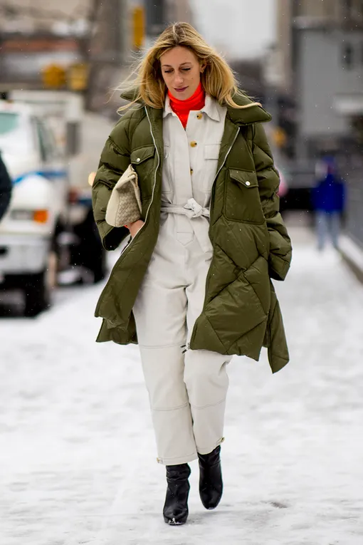 Комбинезон — идеальный выбор для тех, кто темным зимним утром не готов долго размышлять на тему, а что надеть сегодня. Для большего тепла — сперва водолазку. Контрастные цвета сделают образ интереснее. Сверху комфортный пуховик — и стильный комплект без особых усилий готов.
