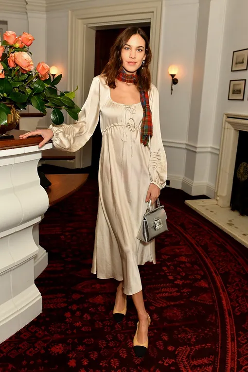 Алекса Чанг смело экспериментирует, чтобы разнообразить привычные зимние наряды для будней и выходов в свет. Так вышло и с этим женственным шелковым платьем молочного цвета актуальной длины мидакси (усредненный вариант между миди и макси). Алекса дополнила эту вещь в винтажном будуарном стиле на первый взгляд неподходящим аксессуаром — простым шерстяным шарфом в шотландскую клетку. Как ни странно, модный прием Алексы сработал: контраст шелка и ретроклетки выглядит очень стильно. Она дополнила наряд классическими двухцветными туфлями «Мэри Джейн» от Chanel и сумкой в стиле 50-х.