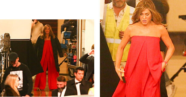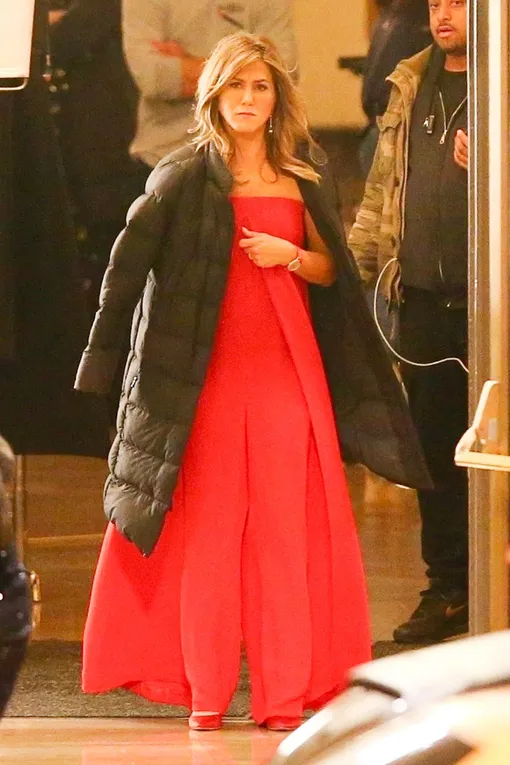 Алый ей к лицу: Дженнифер Энистон в очень широком комбинезоне и лодочках в тон