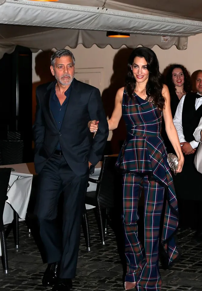 Амаль и Джордж Клуни на минувших выходных были замечены в Вечном городе. Супруги решили посетить Рим и вечером отправились на романтическое свидание в один из местных ресторанов. Для гастрономического вечера Амаль выбрала клетчатый костюм с широкими брюками и топом с баской (возьмите на заметку, что баска – отличный вариант, если собираетесь дегустировать пасту и пиццу).