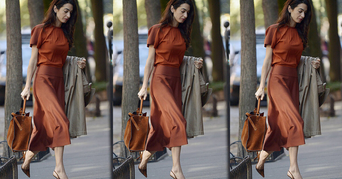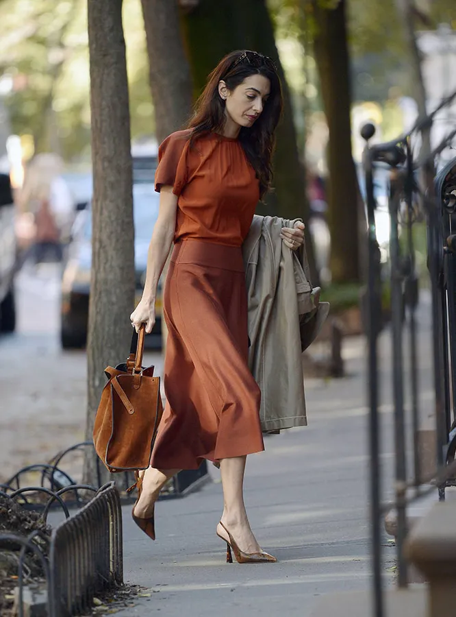 Амаль Клуни поддерживает тренд на монохром и гуляет по Нью-Йорку в терракотовом тотал-луке
