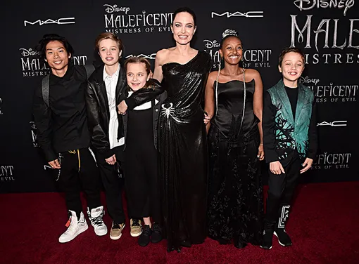 Анджелина Джоли представила в Лос-Анджелесе продолжение киносказки «Малефисента», где она играет ведьму. На премьеру «Малефисенты: Владычицы тьмы» звезда надела блестящее черное платье со скорпионом на бедре от Versace, в котором легко могла бы появиться ее героиня. Поддержать Джоли пришли дети актрисы: 14-летняя Захара, 15-летний Пакс, 11-летние Нокс и Вивьен и 13-летняя Шайло.