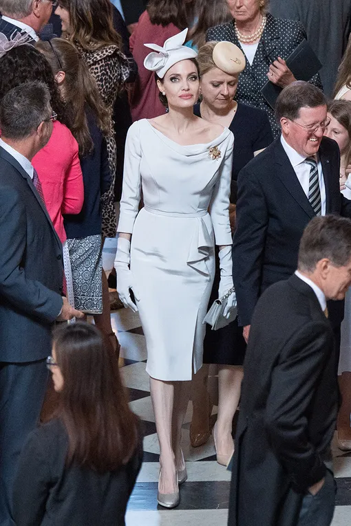 Анджелина Джоли оказалась в числе приглашенных на торжественной службе в честь 200-й годовщины ордена Святых Михаила и Георгия, которая прошла в Соборе Святого Павла в Лондоне. 43-летняя актриса выглядела по всем канонам королевского этикета: элегантная шляпка, перчатки и платье приглушенного светло-серого цвета от Ralph & Russo. В таком образе легко представить одну из герцогинь.