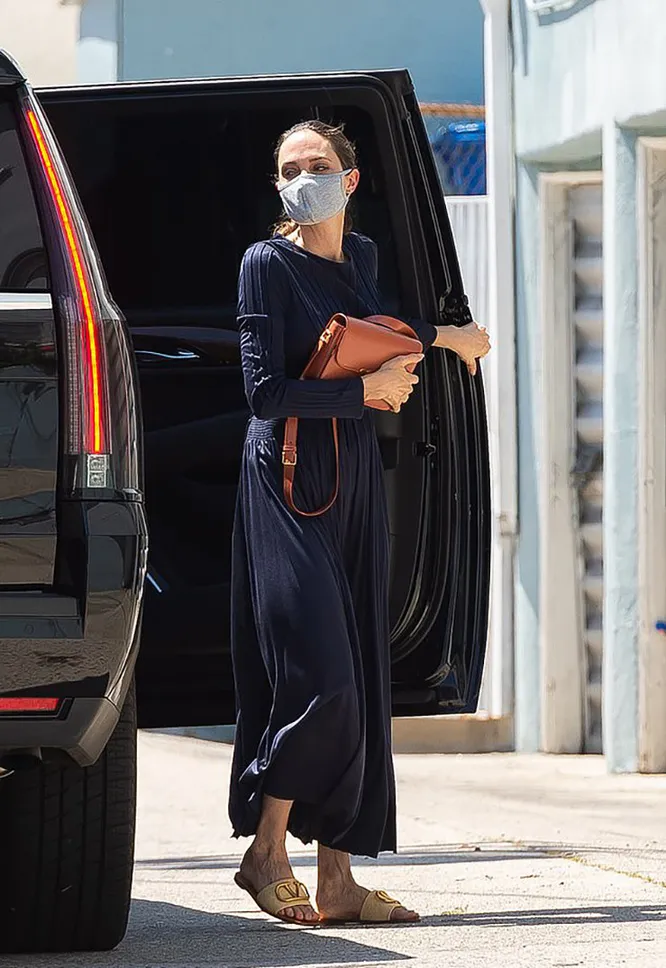 Пока Брэду Питту приписывают новые романы, а сам актер налаживает отношения с экс-супругой Дженнифер Энистон, Анджелина Джоли сосредоточилась на детях и из дома выходит исключительно в случае крайней необходимости. Не так давно голливудская звезда заглянула за покупками в один из местных сувенирных магазинов, где продаются книги, игрушки, подарки, цветы и множество других безделушек. Тогда актриса была в хлопоковом платье цвета хакки с акцентом на талии и кожаных шлепанцах Valentino. Сегодня папарацци вновь подловили актрису – на этот раз на выходе из продуктового супермаркета в Беверли-Хиллз. Для знойного летнего дня Джоли выбрала шелковое платье с длинным рукавом, под которое вновь надела шлепанцы Valentino. Лаконичный образ звезды завершила небольшая сумка из коричневой кожи. Это, пожалуй, самый нарядный повседневный выход Анджелины. Похоже, актриса соскучилась по красным дорожкам и, как и многие звезды на карантине, готова наряжаться даже для похода в супермаркет.