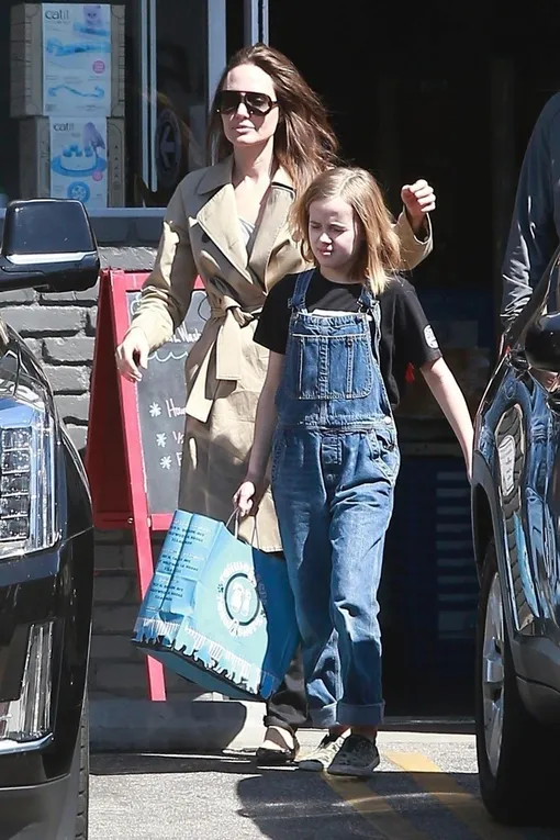 Анджелина Джоли в уютном тренче и остроносых балетках на шопинге с дочерью
