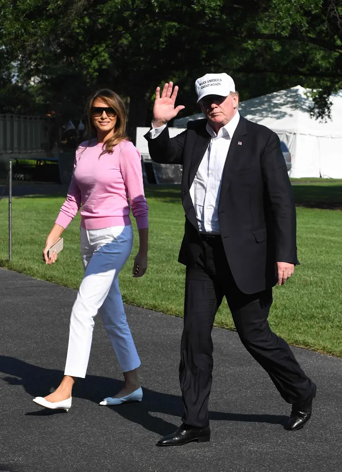 В понедельник Дональд и Мелания Трамп прилетели в Вашингтон из Нью-Джерси, где провели выходные с семьей. На Южной лужайке Белого дома их уже встречали фотографы, которые жаждали запечатлеть прибытие первых лиц страны. Перед публикой Дональд появился в классическом для себя костюме и кепке с коронной фразой Make America Great Again. А вот Мелания выбрала более расслабленный образ в по-летнему нежной гамме: белые джинсы и балетки на небольшом каблуке в тон она дополнила розовым джемпером.