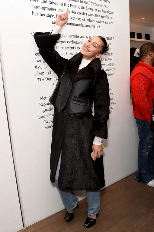 В столице Великобритании было прохладно, поэтому модель решила серьезно утеплиться, чтобы не простудиться в самый разгар модного сезона. Белла надела меховую шубу миди-длины, а поверх нее — кожаную жилетку. Хадид осталась верна своей любви к 90-м и собрала волосы в пучок, выпустив пару прядей у самого лица.