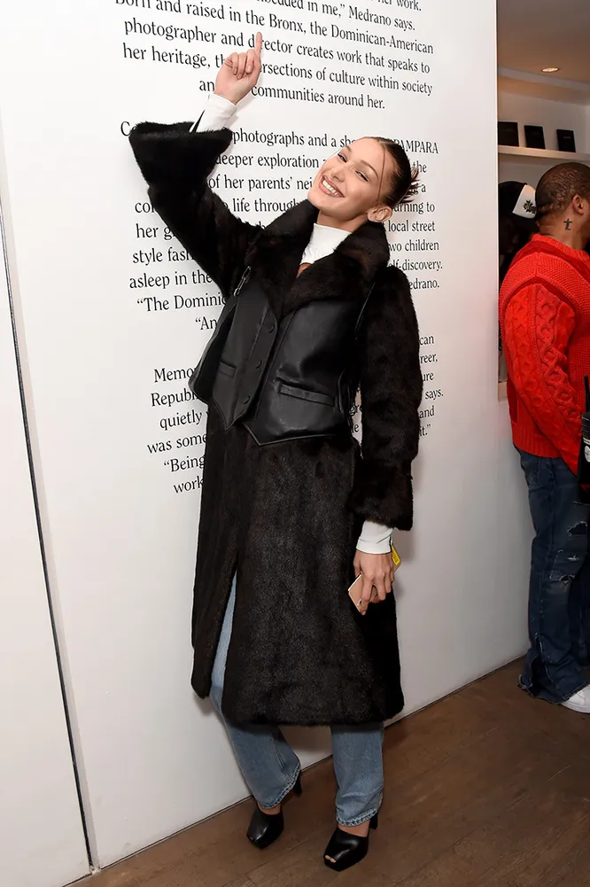 В столице Великобритании было прохладно, поэтому модель решила серьезно утеплиться, чтобы не простудиться в самый разгар модного сезона. Белла надела меховую шубу миди-длины, а поверх нее — кожаную жилетку. Хадид осталась верна своей любви к 90-м и собрала волосы в пучок, выпустив пару прядей у самого лица.