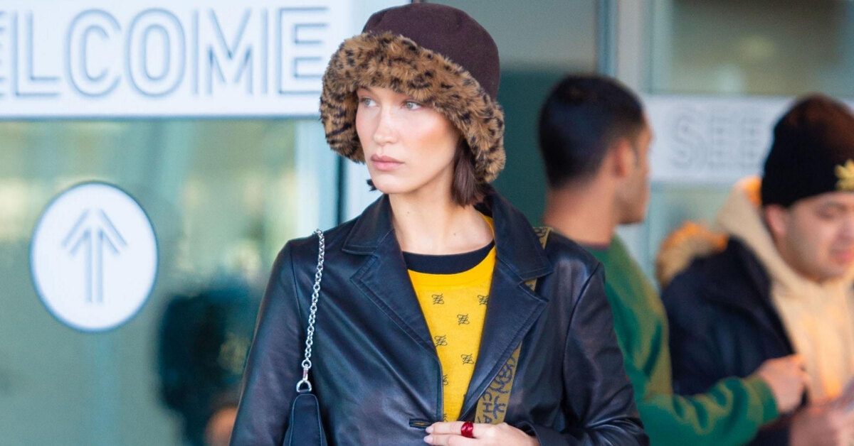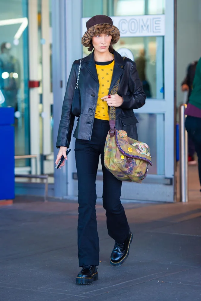 Белла Хадид вернулась из Парижа в Нью-Йорк и выглядела безупречно даже после 8-часового перелета. В аэропорту имени Джона Кеннеди она появилась в кожаном пиджаке, под которым виднелся желтый джемпер, надетый на черную футболку, и в джинсах клеш. Главный акцент Белла сделала на головной убор — панама с леопардовым мехом придала гранж-образу шика и зимнего настроения. Финальным штрихом стали горячо любимые Хадид ботинки Dr. Martens.