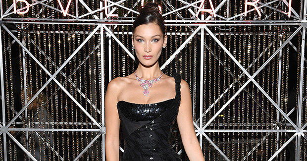 Белла Хадид не первый год носит почетный статус музы и амбассадора ювелирного бренда Bvlgari. Минувшим вечером супермодель стала главной гостьей на праздничном вечере марки, который прошел в рамках Недели моды в Милане. Белла появилась перед фотографами в классическом голливудском образе — черное корсетное платье Vivienne Westwood, усыпанное пайетками, которое она дополнила в буквальном смысле роскошным бриллиантовым колье.