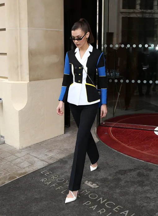В перерывах между показами Парижской недели моды Белла Хадид успевает выгуливать сложносочиненные образы. В очередной раз модель поймали у входа в ее отель. Белла направлялась в шоу-рум LVMH Prize, одного из самых значимых фэшн-конкурсов, который дает старт молодым дизайнерам. Оценивать творения молодых дарований она отправилась в строгом образе: классические брюки, белые лодочки и яркий жакет необычного кроя.
