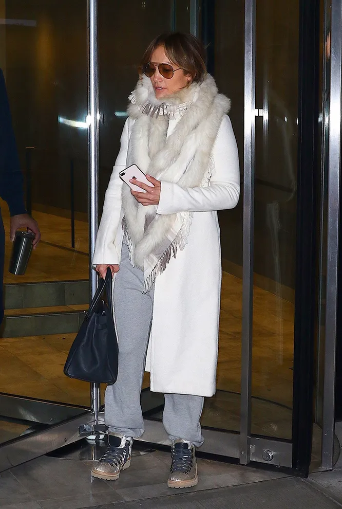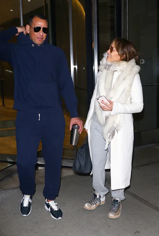 Многие звезды, пребывающие сейчас в холодном Нью-Йорке, стараются носить максимально теплые вещи, ведь погода в Большом яблоке царит уже по-настоящему зимняя. Дженнифер Лопез не исключение: поп-дива основательно пополнила гардероб трикотажными костюмами, уютными свитерами, стильной верхней одеждой и удобной обувью, которая точно не будет предательски скользить по льду. 27 ноября папарацци запечатлели ее вместе с бойфрендом Алексом Родригесом на выходе из спортклуба. Исполнительница была одета в свободные серые брюки, серебристые ботинки на толстой подошве и белоснежное пальто, а шею ее закрывал меховой шарф. В таком наряде замерзнуть просто невозможно!