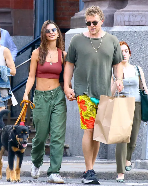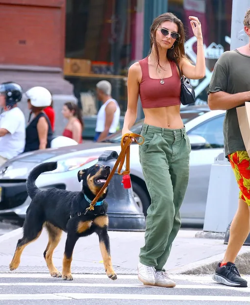 Широкие брюки и облегающий кроп-топ — одно из любимых сочетания Эмили Ратаковски, к которому она прибегает с завидным постоянством. Ведь это лучший способ и идеальный пресс в очередной раз показать, и комфортом при этом не пожертвовать. На этот раз папарацци застали топ-модель на прогулке с мужем и любимым псом по Нью-Йорку: мешковатые брюки цвета хаки, терракотовый топ на широких бретелях, белые кеды и немного простых металлических украшений — лучший образ для расслабленного выходного в компании супруга.
