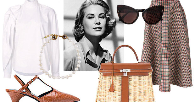 Недолгая, но яркая кинокарьера Грэйс Келли пришлась на эпоху new look, когда миром моды правил Кристиан Диор, поэтому ее гардероб состоял сплошь из расклешенных юбок, приталенных блуз и классических «платьев принцессы» с пышным подолом. В голливудские годы канонический силуэт с подчеркнутой талией, высоким лифом и пышной юбкой для нее создавали костюмеры голливудской киностудии Metro-Goldwyn-Mayer Эдит Хед и Хелен Роуз, а позже, уже в статусе княгини Монако, Грэйс заказывала их у самого Диора. Но главное не изменилось: Грэйс Келли всегда выбирала столь же роскошные, сколько лаконичные и простые вещи в классической палитре из черного, белого, небесно-голубого, молока и пудры: пальто-коконы, брюки на высокой талии, твидовые костюмы, платья-рубашки, жакеты сафари, шелковые каре, белые перчатки, очки в «кошачьей оправе» и жемчуг.
