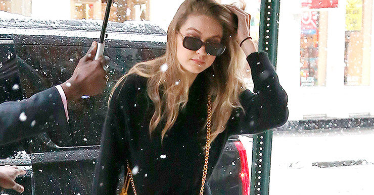 Вчера в Нью-Йорке шел снег. Но несмотря на очевидно холодную погоду, Джиджи Хадид решила не утепляться, а выйти на улицу в джинсах и тонком свитере. Черный монохромный комплект она разбавила яркими акцентами, которыми стали необычная сумка Versace и золотисто-красные ботильоны в тон.