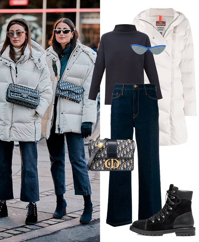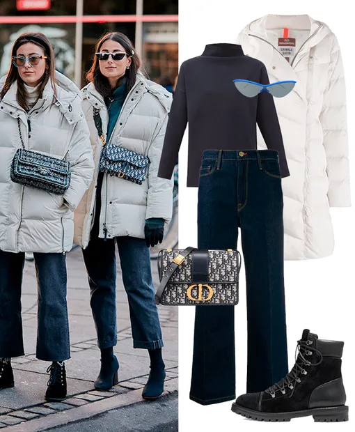 Свитер MAX MARA STUDIO, 20 475 руб.; джинсы FRAME, 18 367 руб.; пуховик PARAJUMPERS, 40 779 руб.; сумка Dior, цена по запросу; очки MYKITA, 30 135 руб.; ботинки VINCE, 24 711 руб.