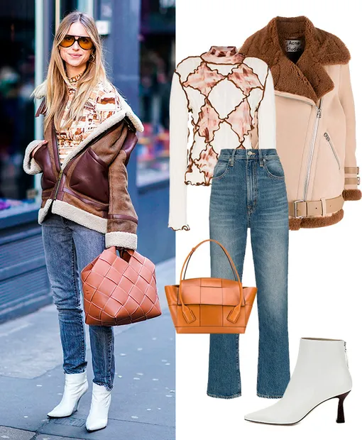 Водолазка ASAI, 17 522 руб.; джинсы SLVRLAKE, 12 953 руб.,; сумка BOTTEGA VENETA, 236 727 руб.; дубленка ACNE STUDIOS, 160 675 руб.; ботильоны WANDLER, 26 257 руб.