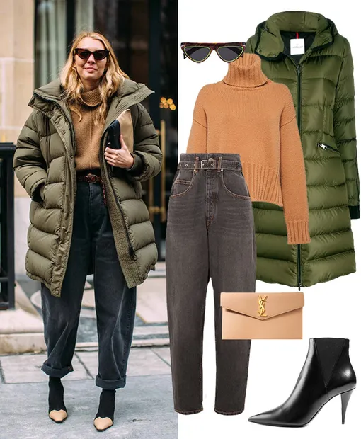 Свитер PRADA, 132 500 руб.; джинсы ISABEL MARANT ÉTOILE, 21 055 руб.; пуховик MONCLER, 99 600 руб.; клатч SAINT LAURENT, 20 052 руб.; очки FENDI, 13 363 руб.; ботильоны SAINT LAURENT, 46 121 руб.