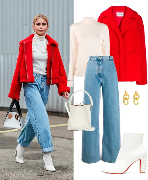 Джемпер CALVIN KLEIN, 8 810 руб.; джинсы GCDS, 14 272 руб.; куртка STAND STUDIO, 16 065 руб.; сережки JIL SANDER, 28 539 руб.; сумка SOPHIE HULME, 16 119 руб.; ботильоны CHRISTIAN LOUBOUTIN, 49 636 руб.