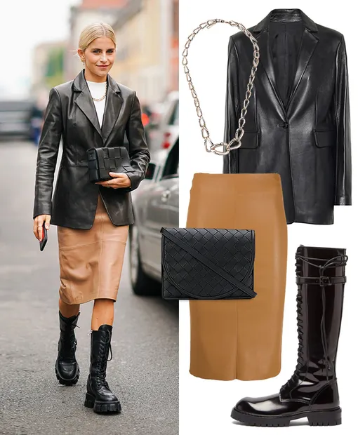 Пиджак JOSEPH, 103 785 руб.; юбка DROME, 45 199 руб.; сапоги ANN DEMEULEMEESTER, 59 315 руб.; сумка BOTTEGA VENETA, 59 315 руб.; цепочка JOHN HARDY, 86 015 руб.