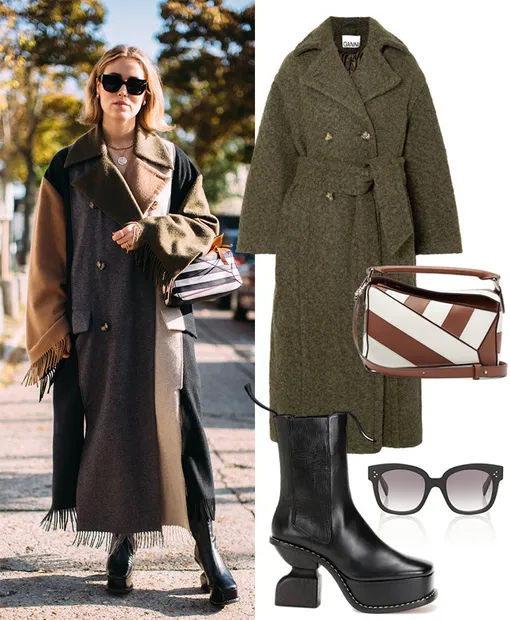 Пальто GANNI [https://www.net-a-porter.com/ru/en/product/1169109/ganni/oversized-double-breasted-wool-blend-boucle-coat], 24 000 руб.; ботинки LOEWE [https://www.mytheresa.com/eu_en/loewe-platform-100-leather-ankle-boots-1316714.html?catref=category], 59 410 руб.; очки CELINE EYEWEAR [https://www.mytheresa.com/eu_en/celine-eyewear-d-frame-acetate-sunglasses-1342436.html?catref=category], 16 293 руб.; сумка LOEWE [https://www.matchesfashion.com/intl/products/Loewe-Puzzle-small-striped-leather-cross-body-bag-1304802], 136 323 руб.
