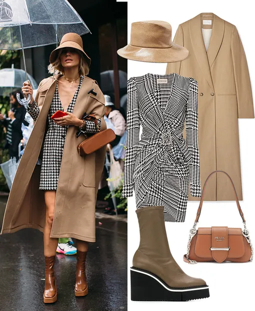 Пальто LA COLLECTION, 64 304 руб.; платье ALEXANDRE VAUTHIER, 135 988 руб.; ботинки CLERGERIE, 33 259 руб,; шляпа CLYDE, 12 530 руб.; сумка PRADA, 115 331 руб.