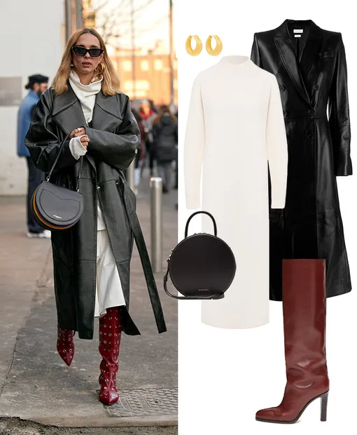 Платье PIETRO BRUNELLI, 11 550 руб.; пальто ALEXANDER MCQUEEN, 200 909 руб.; сережки SOPHIE BUHAI, 28 326 руб; сумка MANSUR GAVRIEL, 48 921 руб; сапоги THE ROW, 116 658 руб.