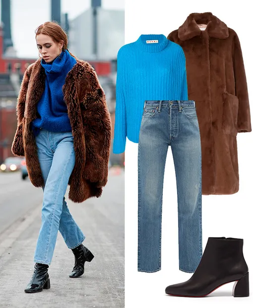 Джемпер MARNI, 30 564 руб.; джинсы CHIMALA, 18 795 руб.; шуба STAND STUDIO, 32 574 руб.; ботинки CHRISTIAN LOUBOUTIN, 52 489 руб.