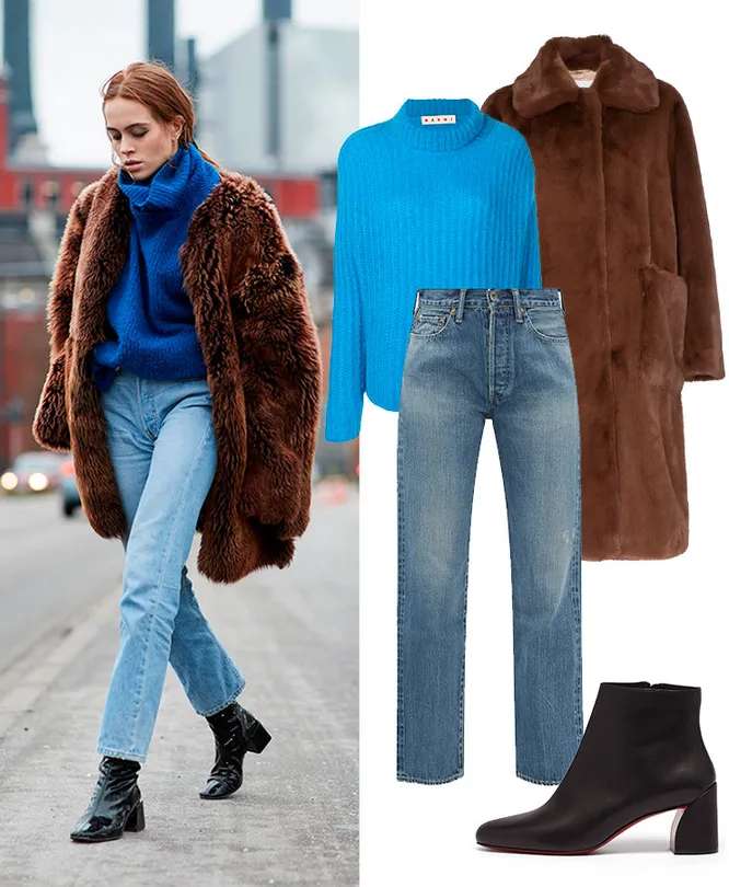 Джемпер MARNI, 30 564 руб.; джинсы CHIMALA, 18 795 руб.; шуба STAND STUDIO, 32 574 руб.; ботинки CHRISTIAN LOUBOUTIN, 52 489 руб.