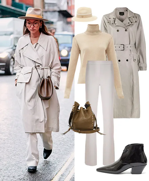 Свитер ALTUZARRA, 30 743 руб.; брюки GLORIA COELHO, 29 415 руб.; тренч ISABEL MARANT, 85 500 руб.; шляпа MAISON MICHEL, 33 693 руб.; сумка ISABEL MARANT, 40 094 руб.; ботинки SAINT LAURENT, 43 752 руб..