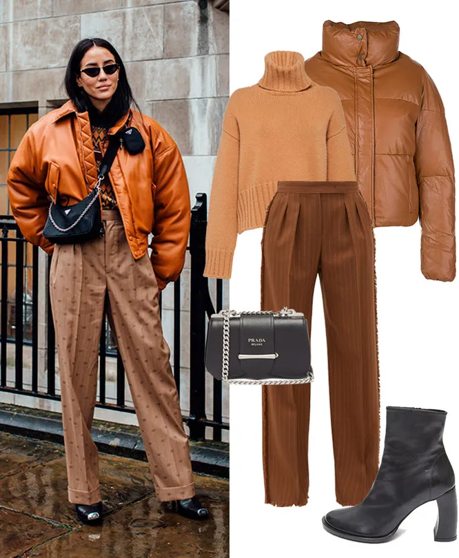 Джемпер PRADA, 132 500 руб.; брюки MAX MARA, 34 015 руб.; пуховик APPARIS, 24 288 руб.; сумка PRADA, 105 794 руб.; ботильоны ANN DEMEULEMEESTER, 36 653 руб.