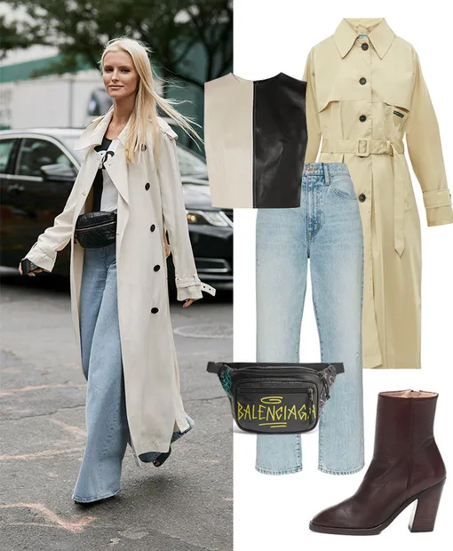 Тренч PRADA, 69 635 руб.; топ 16ARLINGTON, 26 596 руб. ; джинсы SLVRLAKE, 21 858 руб.; ботинки STUART WEITZMAN, 38 961 руб.; сумка BALENCIAGA, 76 240 руб.