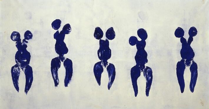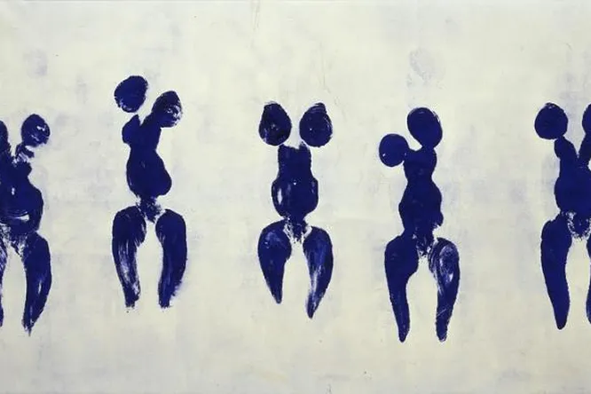 Ива Кляйна чаще всего упоминают как автора знаменитых монохромных работ, запатентовавшего своим именем «идеальный синий цвет» – «Международный синий Кляйна». В 1960 году, за несколько месяцев до того, как официально зарегистрировать формулу «своего» цвета, Кляйн пригласил к себе домой критика и историка современного искусства Пьера Рестани и двух своих подруг, затем измазал обнаженные женские тела синей краской и буквально отпечатал на белом листе бумаги. Получившаяся картина стала началом так называемого «нового антропометрического периода» в творчестве Кляйна. Одна из самых известных работ этого периода – парижский перформанс того же 1960 года, во время которого чинная публика наблюдала за тем, как три обнаженные девушки под «Монотонную симфонию» Кляйна 1949 года оставляли синие следы на развешанных и разложенных по залу Galerie International d’Art Contemporain полотнах.