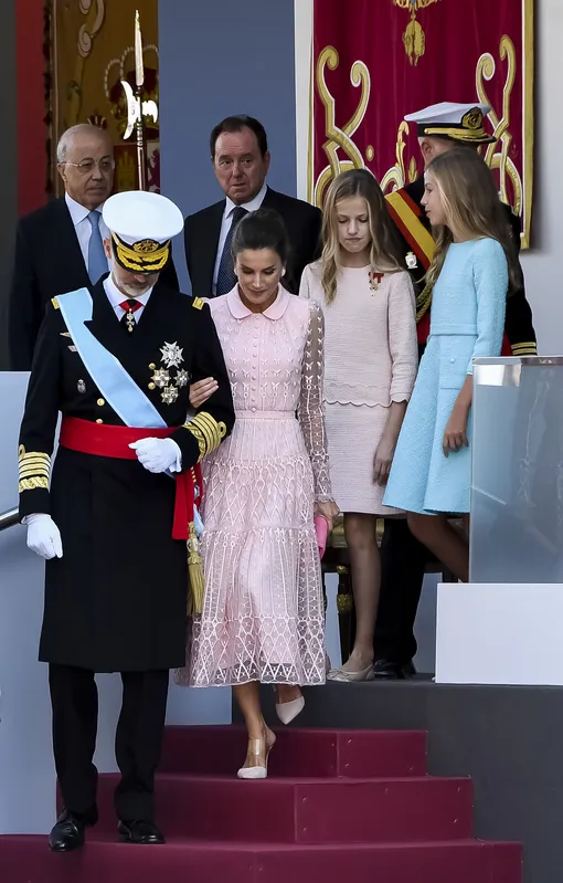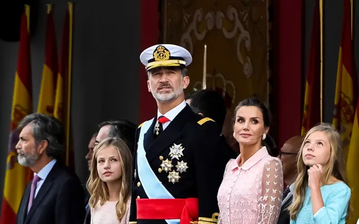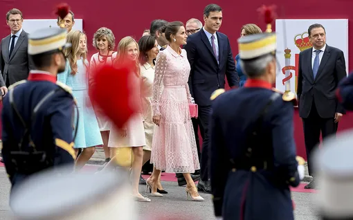 12 октября — важная дата для испанского королевского двора. Именно сегодня отмечают Национальный день Испании и первые лица государства собираются в центре Мадрида на торжественном параде. Королева появилась на площади Лимы в романтичном розовом платье с пышной плиссированной юбкой миди и длинным прозрачным рукавом любимого бренда Felipe Varela. Любопытная деталь наряда — принт бабочка, выполненный на манер кружева. На трибуне Летиция была в сопровождении своего мужа, Филиппа VI и двух дочерей, Леонор и Софии. Прекрасный семейный портрет!