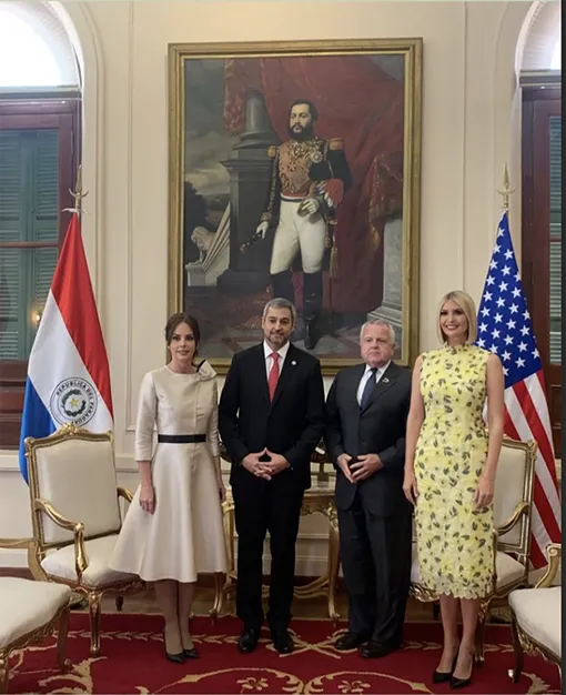 Иванка Трамп продолжает свой тур по Латинской Америке. В эти дни она находится с официальным визитом в столице Парагвая, городе Асунсьон. Для встречи с президентом Марио Абдо Бенитесом и его супругой Сильваной Лопес Морейрой Иванка выбрала элегантное миди-платье без рукавов с рисунком из желтых маков и балетки из переработанного пластика от американского бренда Rothy’s. Первая леди Парагвая для выхода в свет предпочла лаконичное шелковое платье жемчужного цвета с акцентом на талии. Чей образ вам нравится больше?