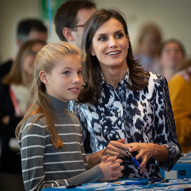 Королева Летиция и Виктория Бекхэм схожи в своих модных «шалостях»: обе фэшиониста любят проверять на «прочность» границы делового стиля и добавлять в официальные образы сложные принты и сочные оттенки. Неудивительно, что первой леди Испании пришелся по душе костюм с леопардовым окрасом от Victoria Beckham: супругу короля Филиппа VI пленила его деликатная черно-белая палитра и сложный крой. Они позволили добавить к блузке и юбке эффектные детали: коралловые слинг-бэк-туфли и двухцветный клатч из мягкой кожи.