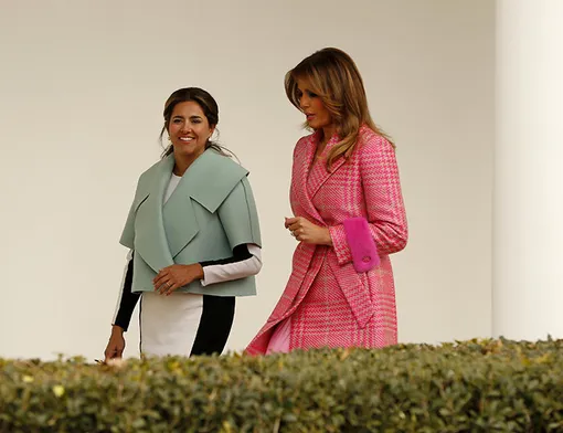 Накануне Дональд и Мелания Трамп устроили прием в Белом доме в честь приезда президента Колумбии Ивана Дуке и его супруги Марии Юлиану Руис. Первая леди приветствовала гостей в конфетно-розовом пальто Fendi c меховыми манжетами за 3 тысячи долларов, которое пользователи сети тут же окрестили «банным халатом». Элегантный образ Мелания дополнила нюдовыми лодочками. Согласитесь, отличный наряд не только для официальных приемов, но и празднования Дня святого Валентина.