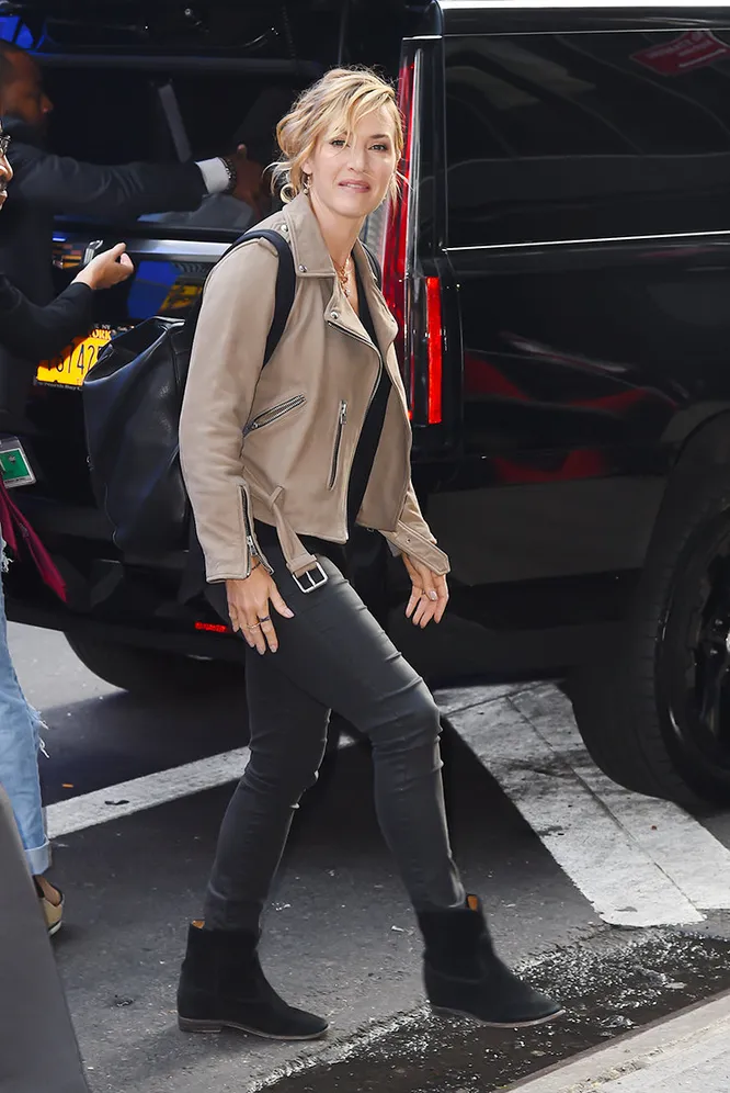Долой черные косухи: Кейт Уинслет в куртке цвета кофе с молоком в Нью-Йорке
