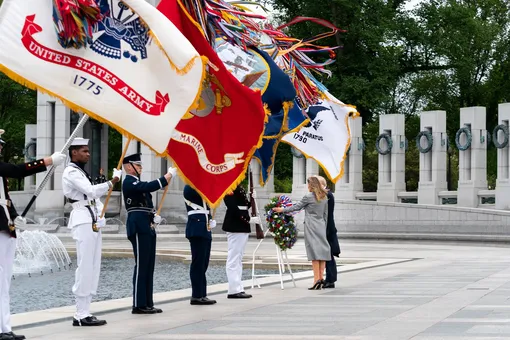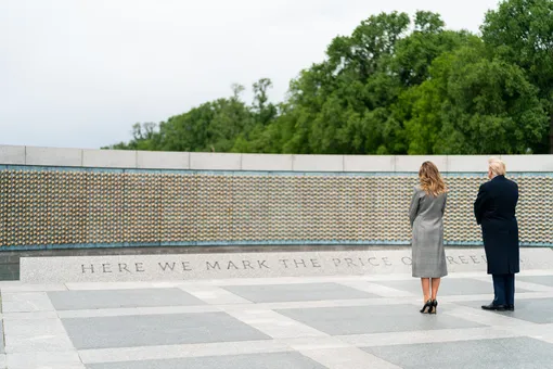 Президент США Дональд Трамп и его супруга Мелания приняли участие в церемонии празднования 75-летия Победы у Мемориала Второй мировой войны в Вашингтоне. Президент и первая леди возложили венки к мемориалу и почтили память военнослужащих, погибших в годы Второй мировой.