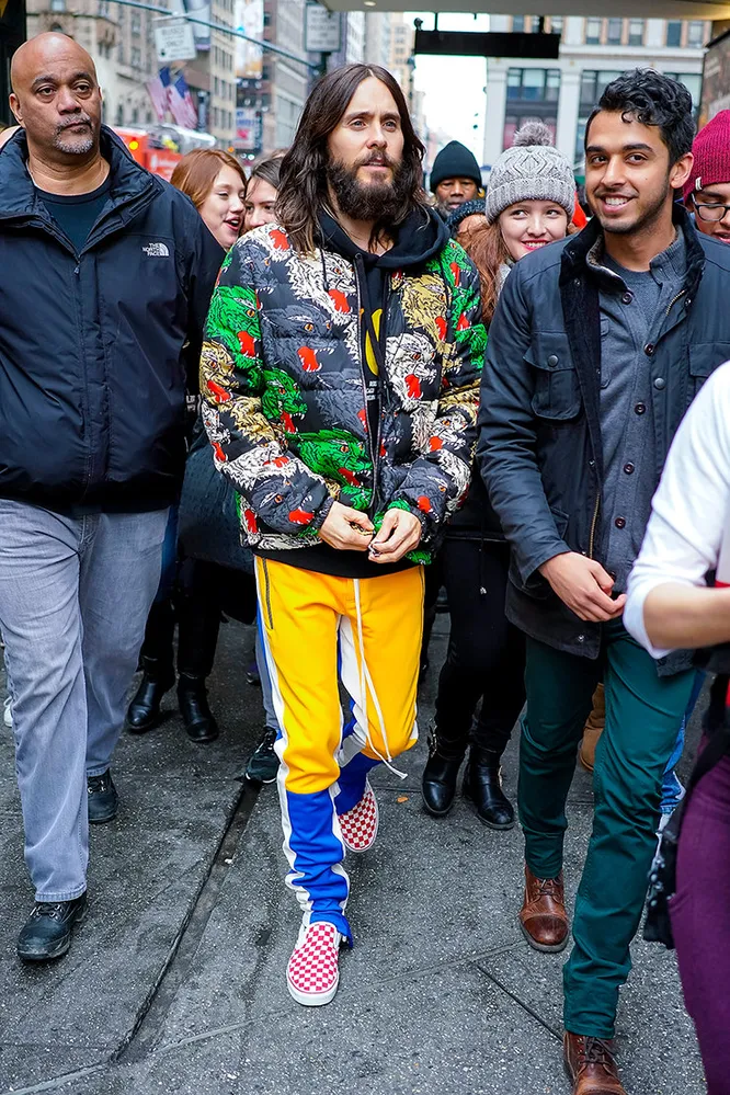 Весна в Россию приходить не торопится, а, вспоминая прошлое лето, мы вообще сомневаемся, что стоит надеяться на жаркую погоду. Поэтому короткий легкий пуховик — вот что летом мы будем носить вместе с кроссовками и платьями. Такой, как у Джареда Лето, отлично подойдет: яркий, забавный и в меру теплый — именно то, что нужно москвичам в ближайшую пару месяцев.