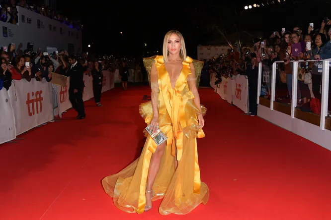 В Торонто продолжается международный кинофестиваль. Важным светским событием вчерашнего дня стала премьера фильма «Стриптизерши», главную роль в котором исполнила Дженнифер Лопес. На красной ковровой дорожке звезда появилась в эффектном желтом платье ближневосточного кутюрного бренда Maison Yeya с прозрачными вставками и глубоким декольте. Завершил образ символичный аксессуар под тематику картины — сверкающий клатч в виде пачки долларов.