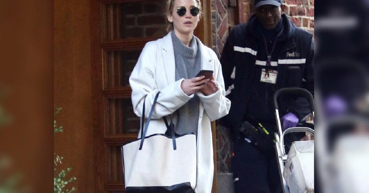 Дженнифер Лоуренс гуляет по прохладному Нью-Йорку в открытой обуви, но кутается в объемный свитер