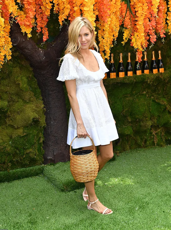 Сиенна Миллер решила пойти по стопам Джейн Биркин, которая не расставались с плетеной корзинкой даже на красных дорожках. Актриса выгуляла самый модный аксессуар лета на мероприятии Veuve Clicquot Polo Classic. Чтобы полностью вжиться в роль иконы стиля, она выбрала романтичное маленькое белое платье из кружева ришелье и телесные босоножки на небольшом каблуке. Образцовый летний образ.