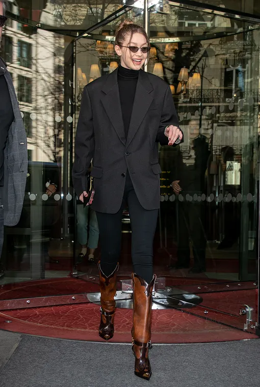 Джиджи Хадид готовится к парижским показам в жакете «с мужского плеча» и ковбойских сапогах