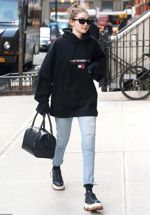 Пока на волне моды на ugly shoes весь мир сходит с ума по кроссовкам Balenciaga Triple S, Джиджи Хадид не поддается на массовые провокации и нашла альтернативную пару обуви. Выбор супермодели пал на кроссовки с массивной подошвой от бренда Eytys. Предчувствуем old out. Повседневный комфортный образ она дополнила облегающими джинсами Redon и оверсайз-толстовкой Vetements x Tommy Hilfiger.