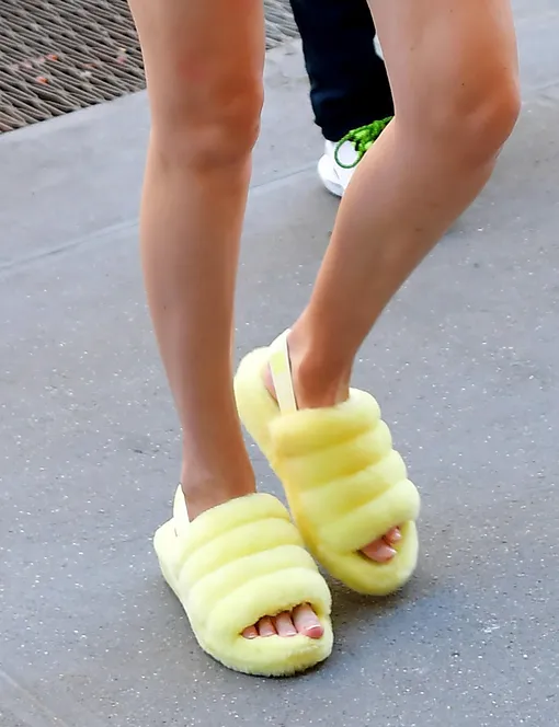Белла и Джиджи Хадид настолько дружны, что даже на прогулку в один и тот же день выходят в похожей обуви. И конечно, им приглянулись модели в максимально эксцентричном дизайне. На прогулку по летнему Нью-Йорку сестры отправились в... меховых босоножках. Белле пришлись по душе сандалии (хотя так их можно назвать с большой натяжкой) от UGG с конфетно-розовым мехом, чью нежную палитру она поддержала при помощи джемпера, надетого на голое тело. А вот Джиджи остановила свой выбор на желтой паре от того же бренда в схожем дизайне. Не знаем, насколько легко ухаживать за такими «пушистиками», но в них определенно уютно гулять по улицам мегаполиса.